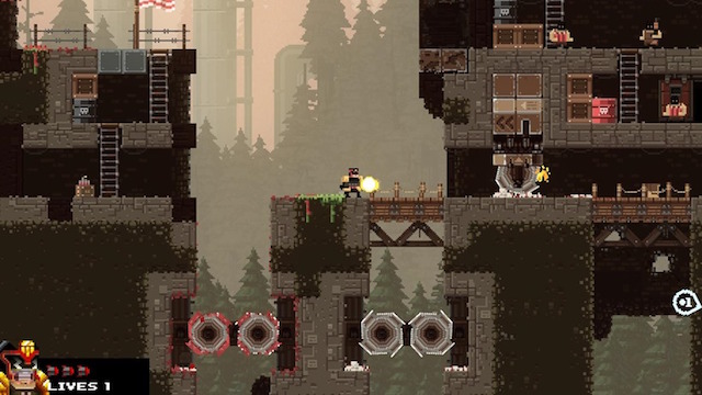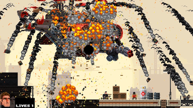Man spielt einen kleinen pixeligen Actionhelden, der alles niedermäht. Auch die aus Blöcken bestehende Landschaft hat keine Chance und verdampft unter dem Kugelhagel. Da fallen einem dann oft Felsbrocken auf den Kopf, oder man gräbt sich mit Schüssen einen Tunnel, um die Gegner von unten oder hinten zu überraschen. Das Gameplay erinnert an Metal Slug und macht richtig Spass. Es ist auch einiges an Physik im Spiel. Oft kann man durch das gezielte Zerbomben eines Fasses haarsträubende Kettenreaktionen von Explosionen in Gang setzen bei denen sich vor dem verdutzten Auge des Spielers der halbe Level von selbst zerlegt, und man am Ende in einem See aus pixeligen Leichenteilen und Blut ungeschoren davon kommt.