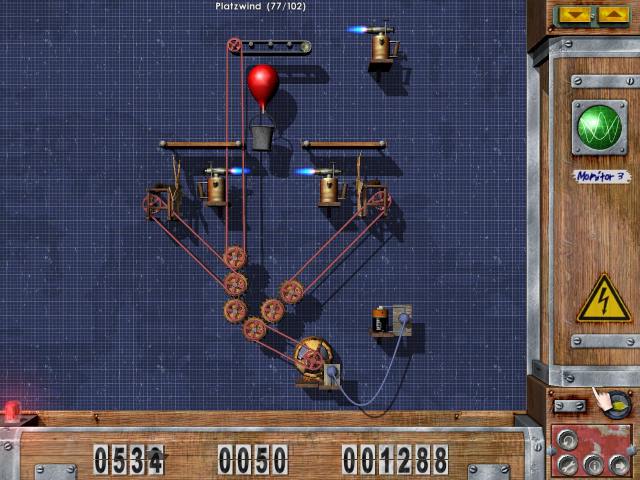 Crazy Machines ist eine moderne Neuauflage des alten TIM (The Incredible Machine) mit viel besserer Grafik, absolut perfekter Physik, und 104 haarstraeubenden Puzzles. In dem Spiel setzt man verschiedene Gegenstaende zu chaotischen Rube Goldberg Maschinen zusammen, um simple Aufgaben wie z.B. “Bring den Eimer auf dem rechten Brett zum stehen,” oder “Zuende die Kerze an” zu loesen, die einem von einem Professor gestellt werden.