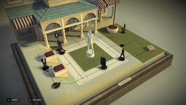 Hitman GO Definitive Edition (Vita) ist ein Puzzlespiel, etwa wie Schach, in dem man sich auf einem Brett Zug für Zug hin und her bewegt. Die Bewegungsmöglichkeiten sind dabei auf schwarz markierte Pfade eingeschränkt, die ein unvollständiges Raster bilden. Die Gegner bewegen sich immer nach dem eigenen Zug, und zwar alle gleichzeitig. Dadurch spielt es sich extrem flott, obwohl es rundenbasiert ist.