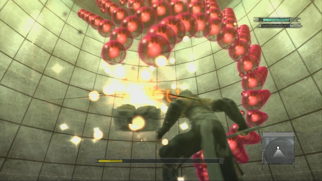 Plötzlich bekommt man aber eine “Option” wie bei Gradius als Bonus, die um einen herumkreist und wie in einem Shmup schiesst (wtf?). Dazu zoomt die Kamera in eine Draufsicht und die Gegner kommen auf einmal wie in Space Invaders als Formation aus vielen kleinen Gegnern auf einen zu! Die Gegner schiessen Salven aus Bullet-Hell Projektilen auf mich, und ich glaube es kaum, auf einmal spiele ich ein Bullet Hell Shmup!