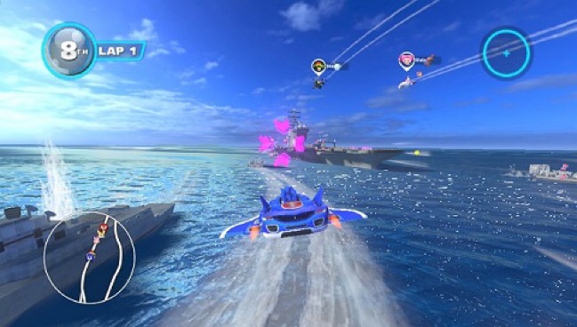 Die Strecken sind wirklich originell. Es gibt normale und korkenzieher Loopings, aber auch ganze Streckensegmente in denen man als Flugzeug oder Boot herumrast. Alles orientiert sich hier an alten Sega Spielen. So gibt es eine Afterburner Strecke, bei der man auf einem Flugzeugträger landet, aber auch Panzer Dragoon und Samba de Amigo (!) Strecken. Neben Sonic und Tails sind auch Ulala von Space Channel 5 und Alex Kidd mit in dem grossen Ensemble von originellen Charakteren.