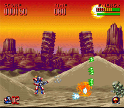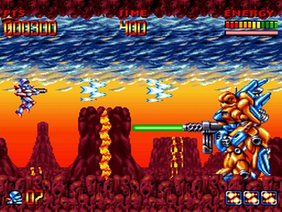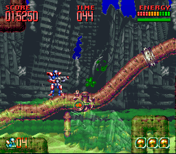 Leider komme ich bei Super Turrican immer bis zu einer rutschigen Schneewelt, in der man nervig herumschlittert. Da fall ich dann immer wiederholt in den Tod.