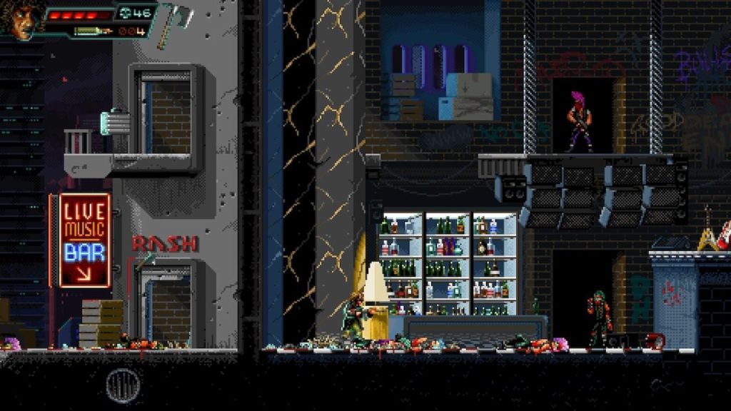 Im Gegensatz zu Probotector kann man in Huntdown nicht nach oben schiessen, nur gerade nach vorne und im Ducken. Dafür kann man aber Granaten, Äxte, und andere Fernwaffen schmeissen. Es gibt viele Waffen. Der Thumper gefällt mir am Besten. Das ist eine Art mobiler Mörser. Die “Pfump!” Geräusche beim Schiessen sind befriedigend. Auf jeden Schuss mit dem Thumper folgt dann das erwartete Explosionschaos mit viel Blut und Leichen.