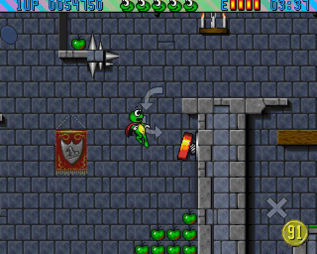 Grafik und Technik sind meiner Meinung nach perfekt. Das Scrolling ist flüssig und die Münzen und Gegner sind schön animiert. Selbst die Hintergründe sind manchmal animiert. Zum Beispiel gucken die Bäume mit ihren Augen dem Spieler hinterher. Die Tilesets sind mit vielen abwechslungsreichen Details gestaltet. In der Burg kleben zum Beispiel manchmal Spinnweben an den Ecken, oder es gibt hier und da Risse in den Wänden. Durch solche häufigen Details wirkt die Hintergrundgrafik weniger repetitiv als in anderen Spielen dieser Art. Superfrog winkelt sogar seine Füsse an, wenn er auf einer schiefen Ebene steht!