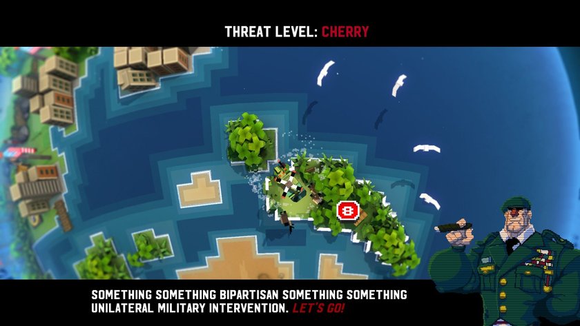 Das Spiel ist ein waschechtes Arcadespiel im 2D Pixellook, so eine Art Mischung aus Metal Slug und Spelunky, vom Setting her geht es in Richtung “Expendables” und “Team America.”
