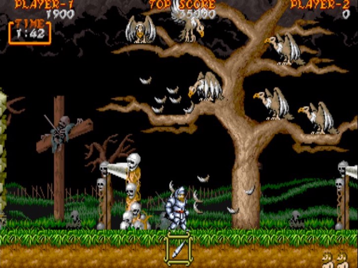 Ich habe Ghouls’n’Ghosts (Arcade US, Vita und PC) durchgezockt, einmal auf Vita und einmal auf PC, emuliert via Retroarch FBNeo. Ich habe die Default Dipswitches (Medium Difficulty etc.), keine Cheats und keine Savestates benutzt, aber so viel virtuelles Geld nachgeschmissen, wie ich wollte. Auf dem MiSTer FPGA muss ich es auch mal probieren, da ist es vor Kurzem ebenfalls erschienen.