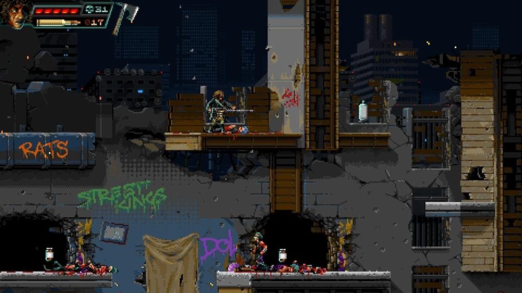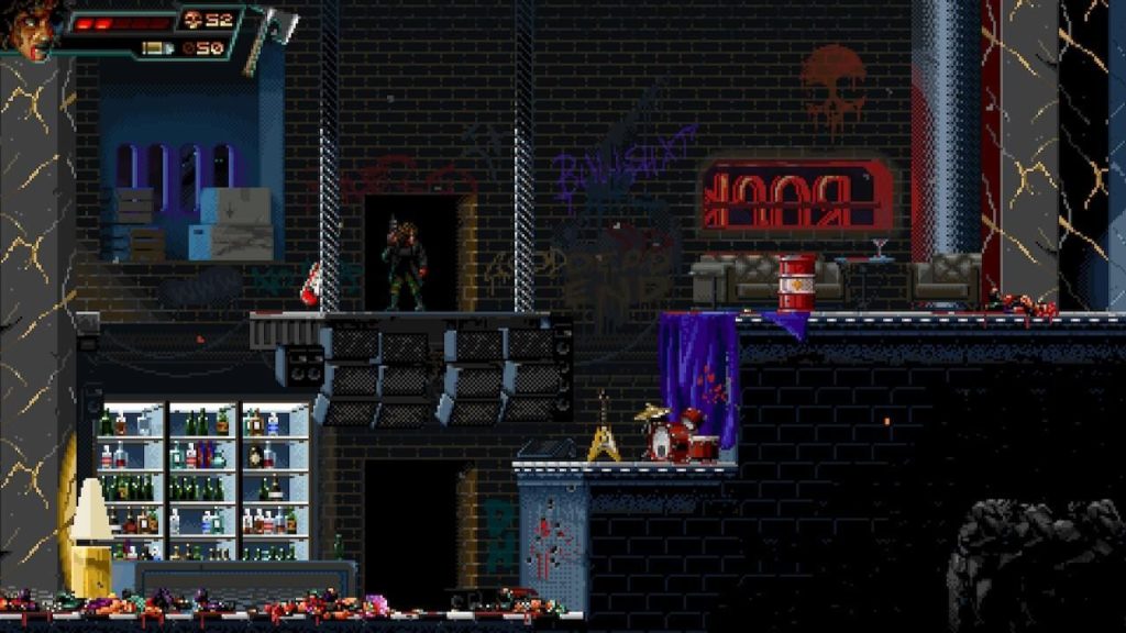 Im Gegensatz zu Probotector kann man in Huntdown nicht nach oben schiessen, nur gerade nach vorne und im Ducken. Dafür kann man aber Granaten, Äxte, und andere Fernwaffen schmeissen. Es gibt viele Waffen. Der Thumper gefällt mir am Besten. Das ist eine Art mobiler Mörser. Die “Pfump!” Geräusche beim Schiessen sind befriedigend. Auf jeden Schuss mit dem Thumper folgt dann das erwartete Explosionschaos mit viel Blut und Leichen.
