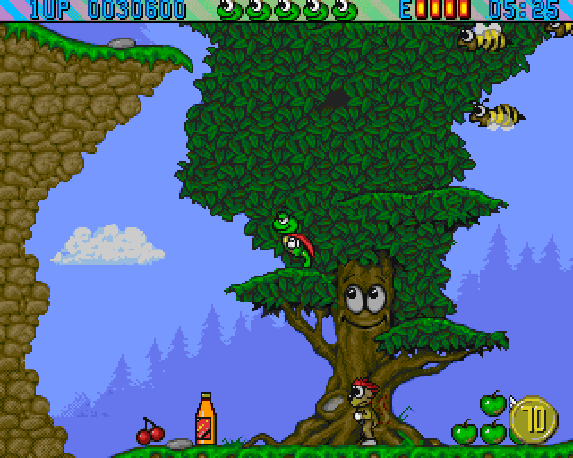 Grafik und Technik sind meiner Meinung nach perfekt. Das Scrolling ist flüssig und die Münzen und Gegner sind schön animiert. Selbst die Hintergründe sind manchmal animiert. Zum Beispiel gucken die Bäume mit ihren Augen dem Spieler hinterher. Die Tilesets sind mit vielen abwechslungsreichen Details gestaltet. In der Burg kleben zum Beispiel manchmal Spinnweben an den Ecken, oder es gibt hier und da Risse in den Wänden. Durch solche häufigen Details wirkt die Hintergrundgrafik weniger repetitiv als in anderen Spielen dieser Art. Superfrog winkelt sogar seine Füsse an, wenn er auf einer schiefen Ebene steht!